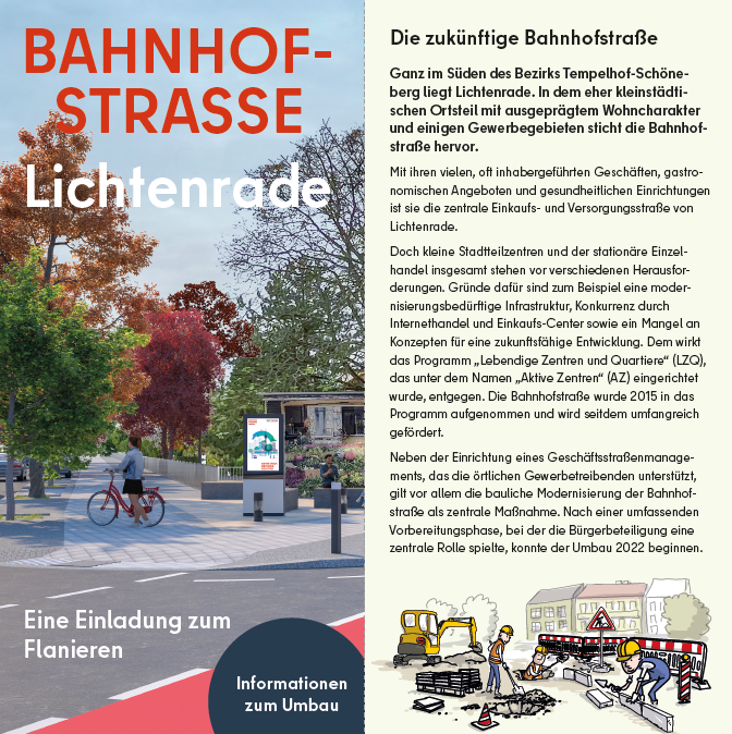 Im Rahmen der Umbauarbeiten in der Bahnhofstraße, hat das AZ Lichtenrade gemeinsam mit der Kommunikationsagentur georg+georg ein Infofaltblatt erstellt. Mit Hilfe dessen wird anschaulich dargestellt wie die Bahnhofstraße künftig aussehen wird und was mit dem Umbau erreicht werden soll. Anhand von Grafiken erfahren Sie mehr zum künftigen Aussehen der Straße und können verortet das neue Mobiliar betrachten.