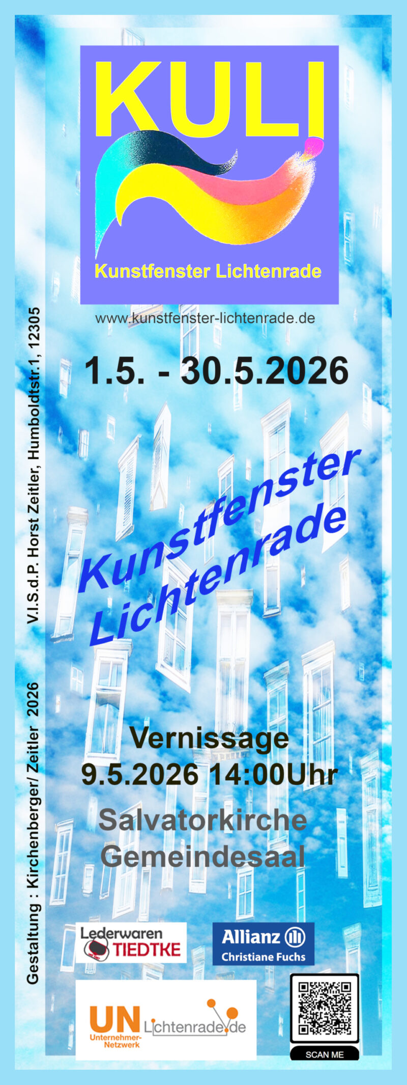 Das Kunstfenster Lichtenrade findet in diesem Jahr vom 01. – 30. Mai statt und lädt Sie am 09. Mai zur Vernissage in den Gemeindesaal der Salvatorkirche ein! Informationen werden auch auf der Website und der Instagramkanal des Kunstfensters eingestellt.